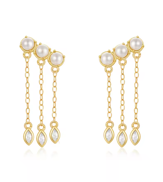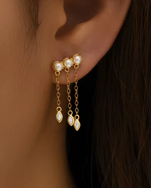 Aros colgantes con un diseño moderno diseño que incluye perlas de rio blancas naturales y bellos cristales que le dan movimiento.
