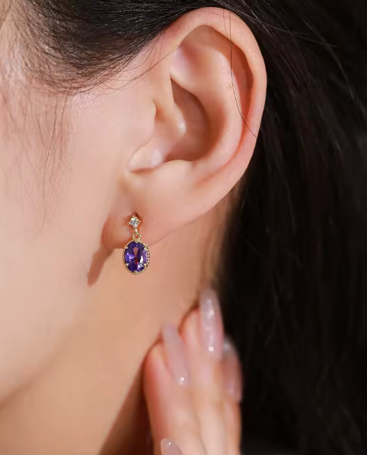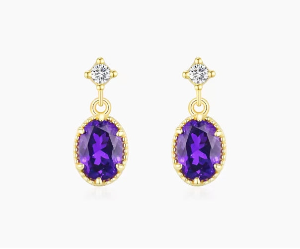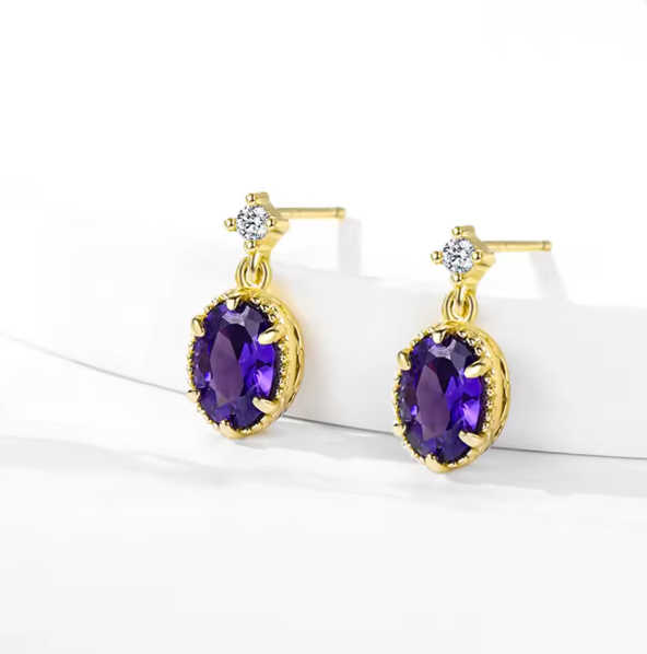 Aros colgantes con un diseño de circón morado y detalles de circones blancos. El color morado resalta muy bien dentro del color oro.