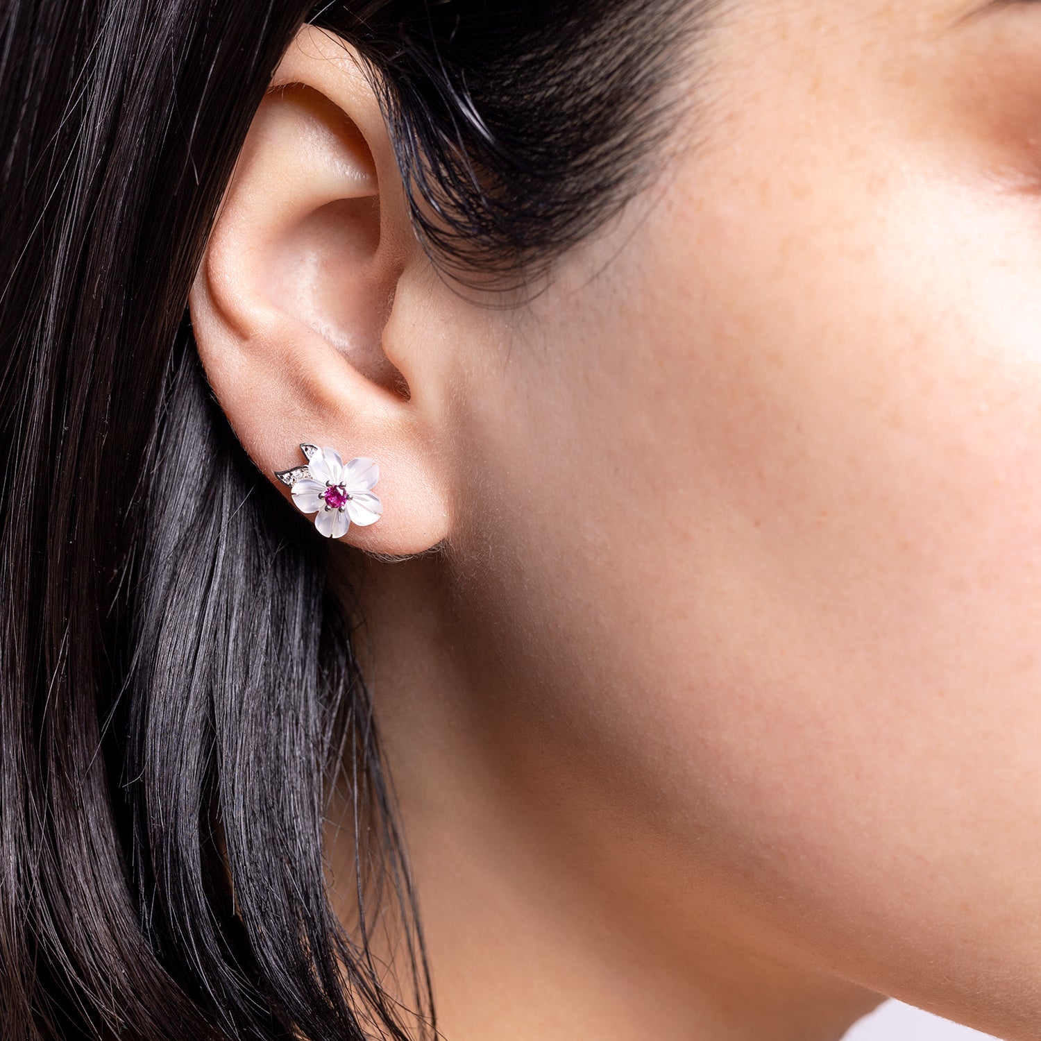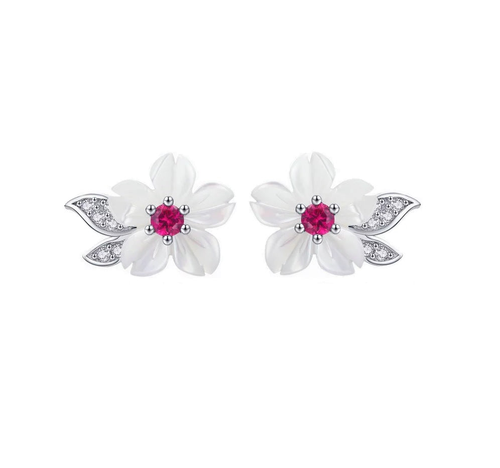 Un diseño primaveral que perdura durante todo el año. Este aro esta hecho con una base de plata, decorado un un nácar natural blanco en el cual fue tallado lo detalles de una hermosa flor y en su centro un pequeño granate rojo.