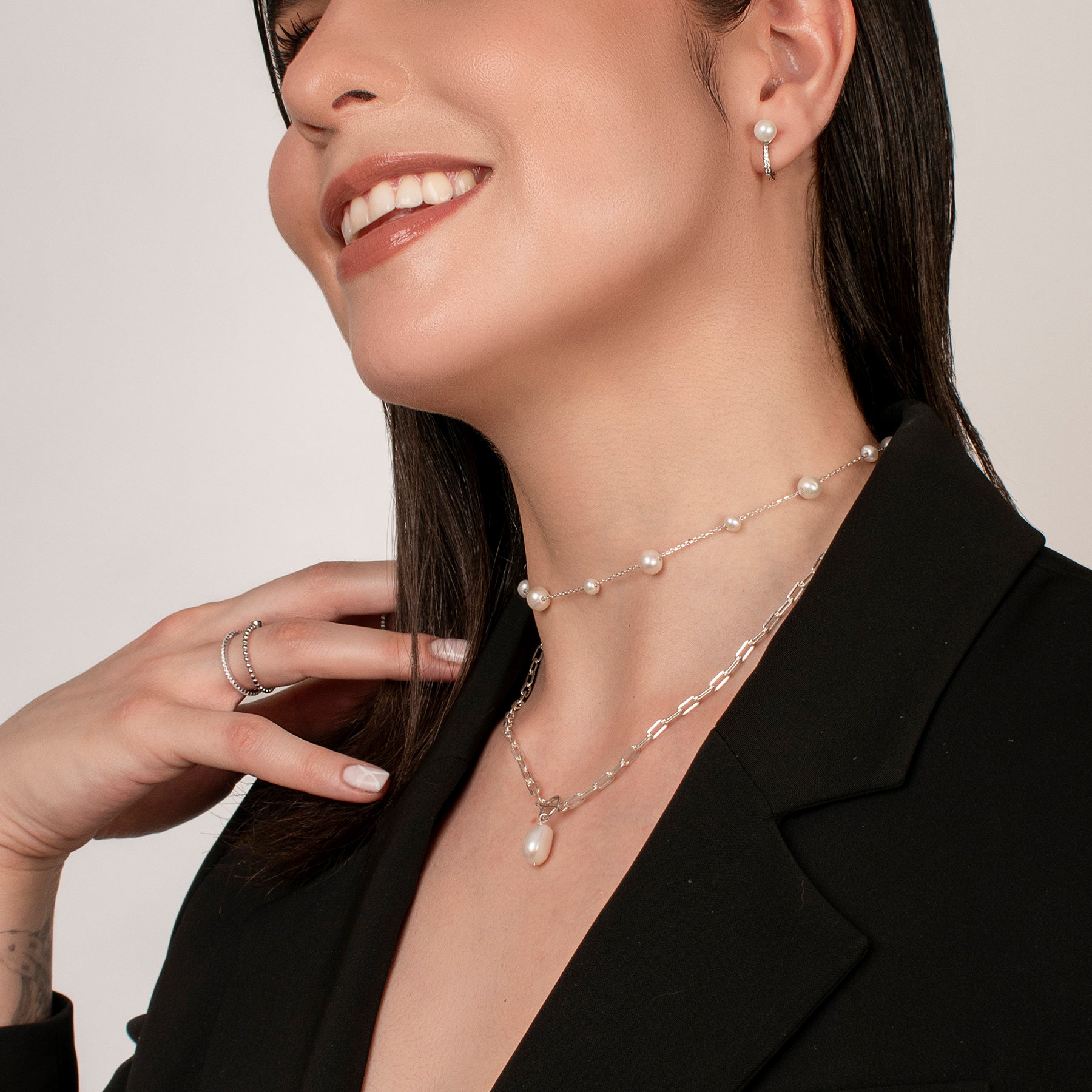 Bellos y delicados aros de plata con circones blancos y adorno de perla blanca.