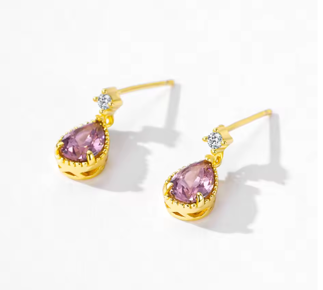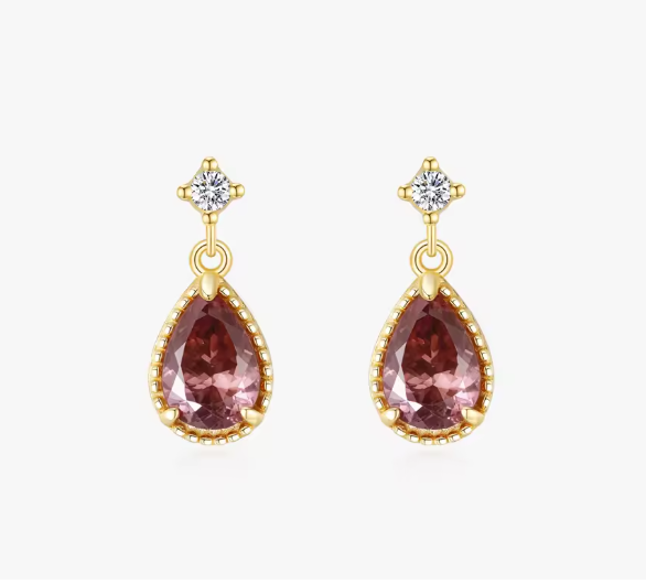 Aros colgantes con un diseño acompañado de una rodolita en forma de gota y detalles de circones blancos. El color de la rodolita resalta muy bien dentro del color oro.