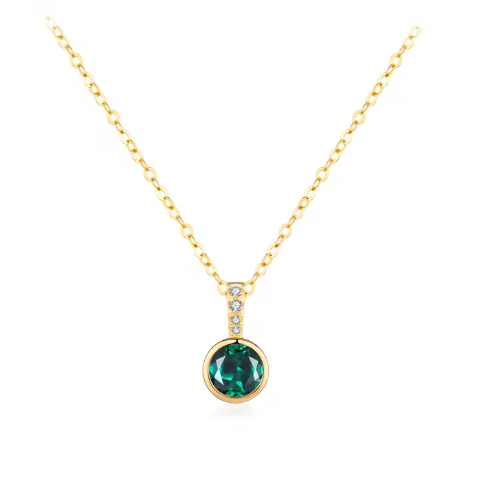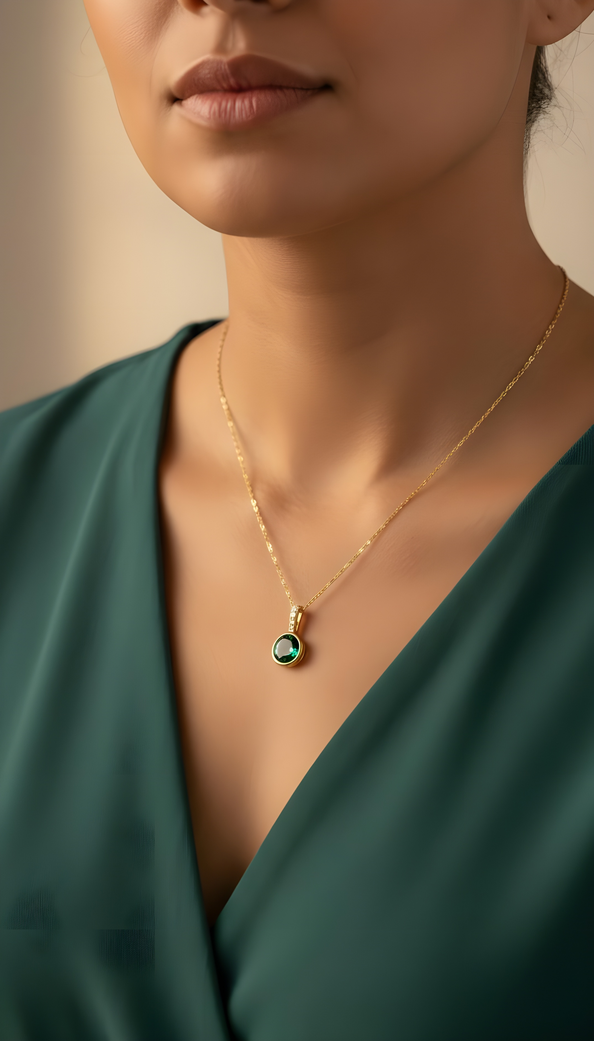 Collar hecho de plata con baño de oro, resaltado con un diseño de punto de luz de circón color verde esmeralda con detalles de circones blancos pequeños, Su cadena es ajustable, por lo cual puedes regular su largo según la ropa que uses o si gustas combinarlo junto a otro collar adicional.