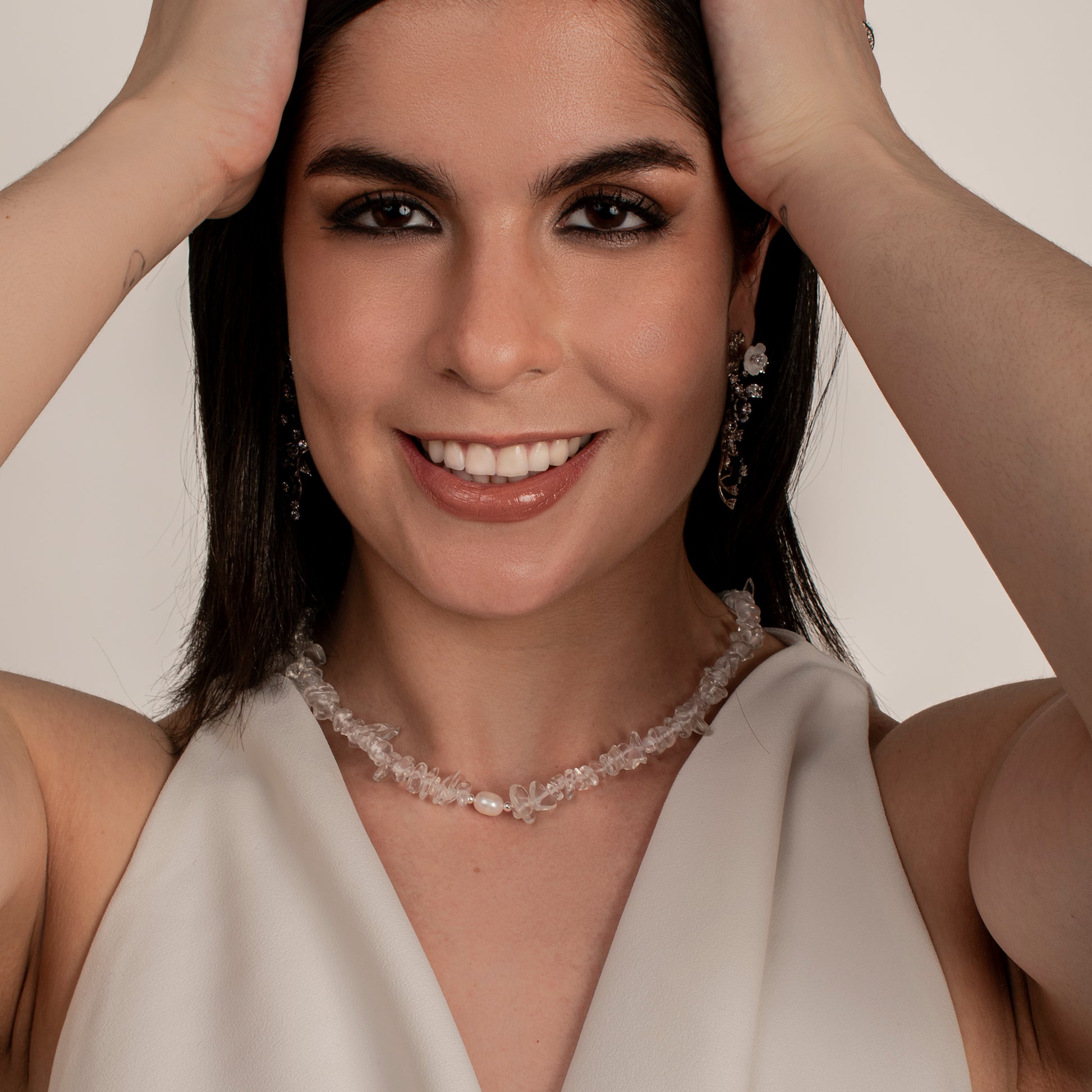 Bello collar hecho de cuarzo blanco con estilo rústico y decorado con una perla barroca natural blanca de 13 milímetros, terminales y broches hechos completamente de plata. Este collar entrega un estilo mas relajado sin dejar nuestro su estilo de sofisticación.