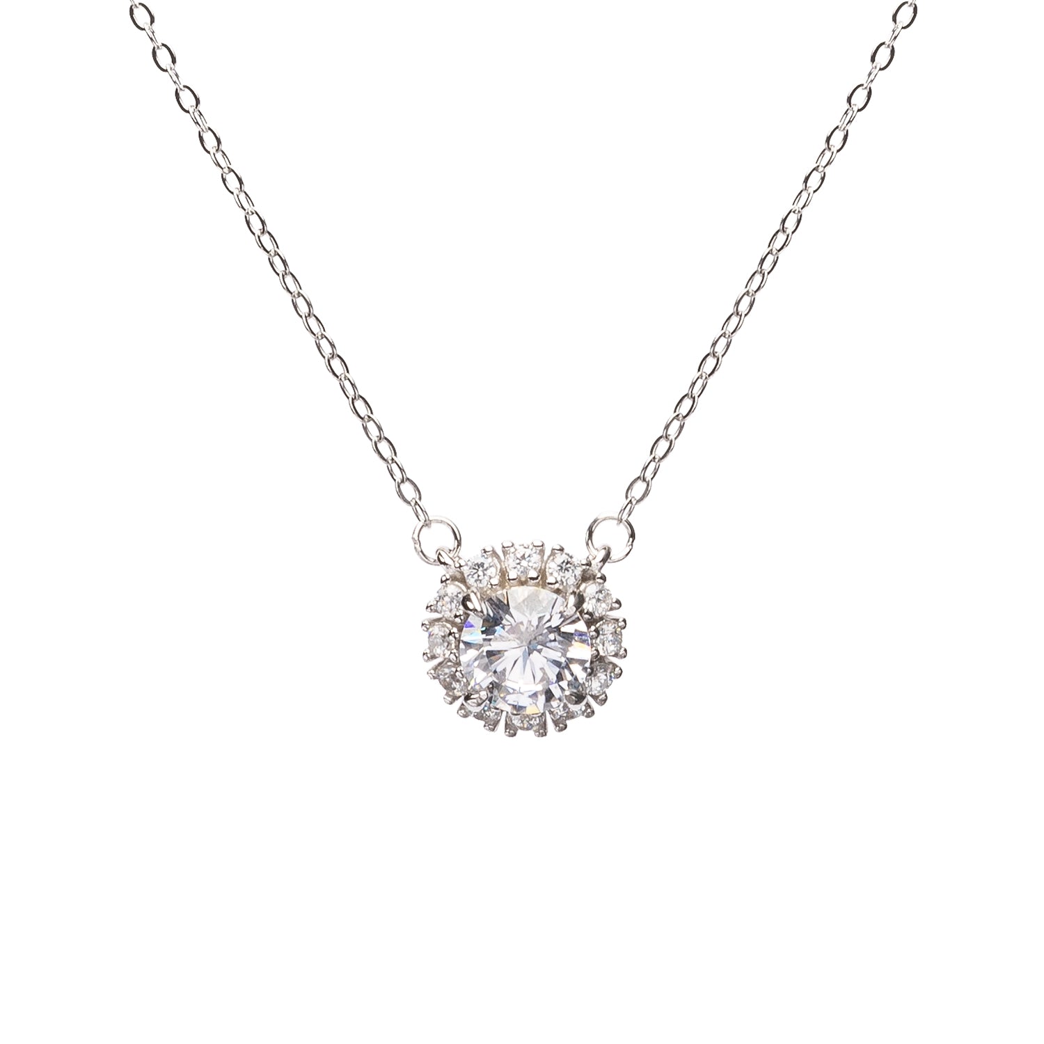 Elegante collar punto de luz hecho completamente de plata con un hermoso cristal blanco en el centro rodeado de circones blancos, una verdadera fiesta de destellos y luz.