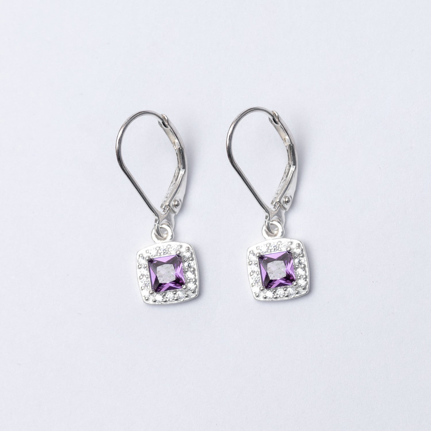 Conjunto de plata con piedra amatista con circones blancos. Aros colgantes con cierre de gancho que da una mayor seguridad.
