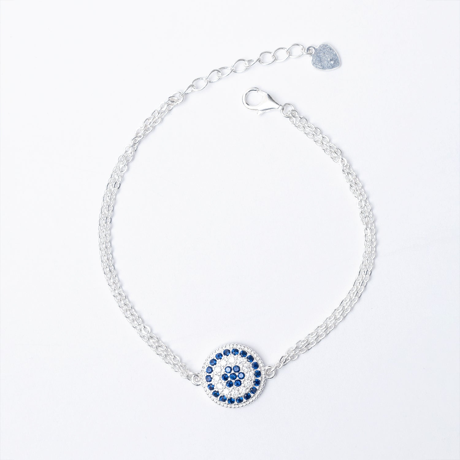 El ojo turco es un amuleto protector contra las malas energías, esta pulsera está hecha de plata con doble cadena, incrustaciones de circones blancos y azules.