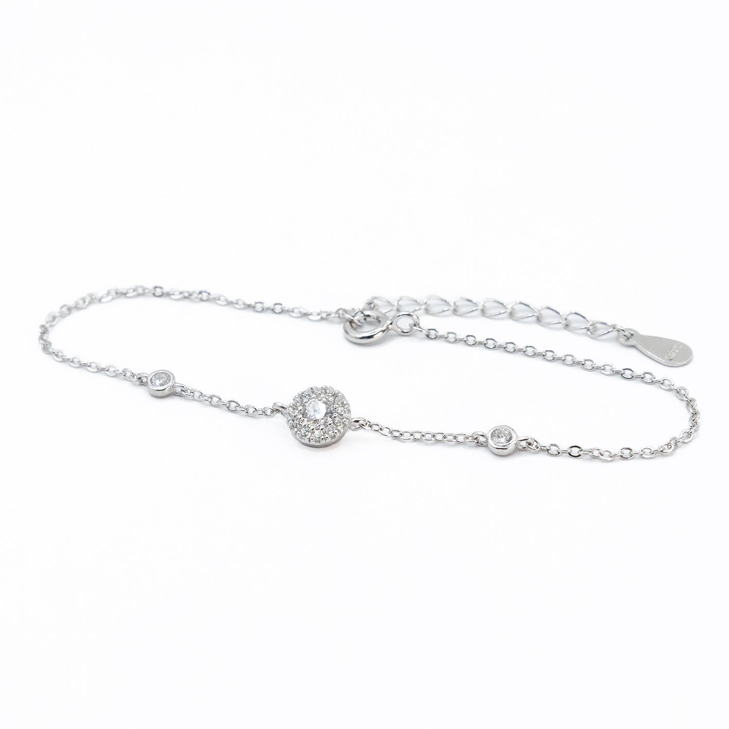 Esta hermosa y delicada pulsera esta hecha completamente de plata.con un diseño de halo engastado con circones blancos Es perfecta para toda ocasión y muy fácil para combinar junto a otras pulseras.